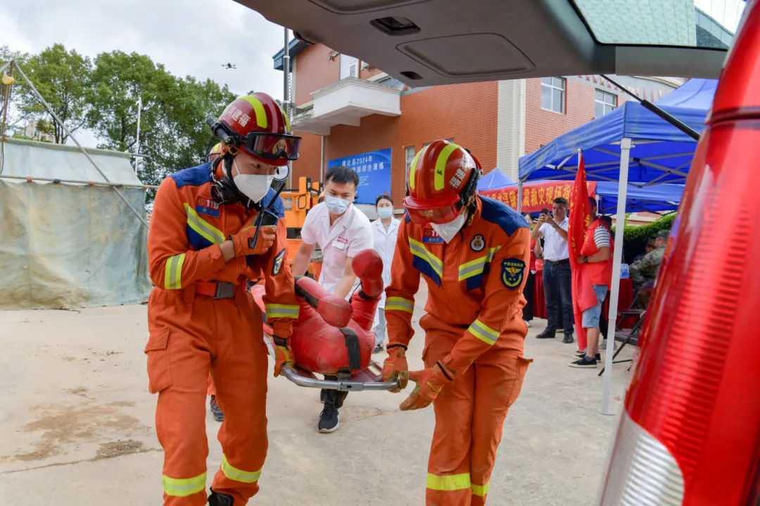 地震救援开始,因房屋损毁导致厨房燃气管道泄漏,现场火花四溅,救援人员先后用灭火无人机、消防机器人、涡喷消防车合力将其扑灭,关闭燃气管道阀门,现场火灾险情得以解除。随后,救援人员利用蛇眼生命探测仪快速锁定被困人员位置,通过顶撑加固、支护破拆、创建救援通道等方式将被困人员顺利救出,医护人员立即对其进行包扎救治,并将1名重伤者转运医院。经过指挥部营地搭建、废墟搜索救援、伤员救援转运等一系列紧张有序的救援行动,所有被困人员全部转移至安全区域,随着搜救结束,应急演练也圆满完成。