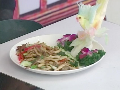 【干煸麻丝菇】 麻丝菇是德化特产,是季节性较强的时令菌菇,生产于六、七月盛夏。由于时节短、质地好、营养高、价位贵,因此人们称其为“菌菇王”。干煸清炒两宜,深受人们青睐。