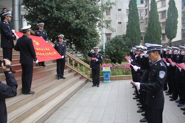 “我们将严守纪律、珍惜荣誉、团结一心、树好形象……”在郑贵军大队长的带领下,120多名人员举起右拳,面对党旗庄严宣誓,用铿锵有力的声音向党许下铮铮誓言。铮铮的誓言,彰显着交警时刻牢记使命,主动践行警察核心价值观。