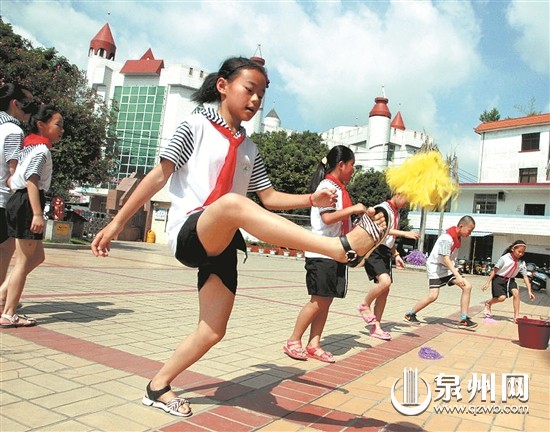 德化龙浔镇龙浔中心小学日前组织学生进行滚铁圈、踢毽子和踩高跷比赛。滚铁圈、踢毽子、踩高跷,是老一辈的少儿游戏,以前的玩具大多就地取材,自己制作,虽然简陋,但可以锻炼肢体的协调灵活,大伙儿也玩得开心。现在的孩子玩惯了父母买的电子玩具,对这些游戏未免感到稀奇。该校在校园活动中有意识地引入传统游戏,寓教于乐,让孩子体验简单的快乐。(徐艺星 摄)