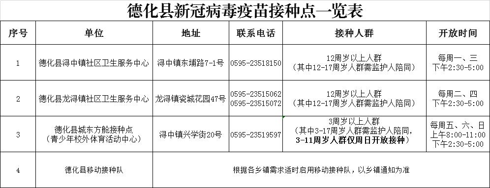 2.浔中镇、龙浔镇社区卫生服务中心接种服务时间无变动。详见下表: