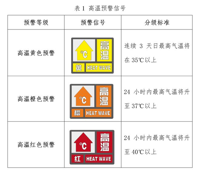 (1)高温预警信号。《气象灾害预警信号及防御指南》规定高温预警信号分三级(详见表1)。