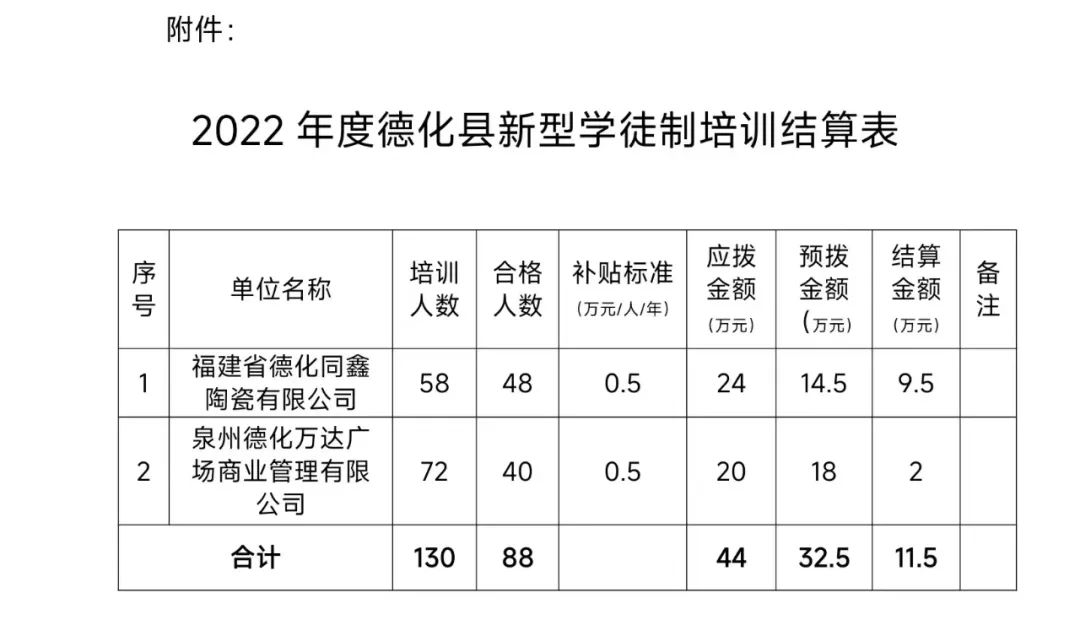 根据《泉州市人力资源和社会保障局转发福建省企业新型学徒制培训补贴申请操作指南(试行)的通知》(泉人社文〔2022〕137号)、《泉州市人力资源和社会保障局转发关于进一步明确企业新型学徒制培训工作若干问题的补充通知》等文件精神,福建省德化同鑫陶瓷有限公司等2家单位开展2022年度企业新型学徒制培训中级工班结业考核合格共88人,企业备案材料已经通过省平台审核,符合政策要求,拟拨付结算金额11.5万元(详见附件),所需资金从就业补助资金中列支,现予公示。