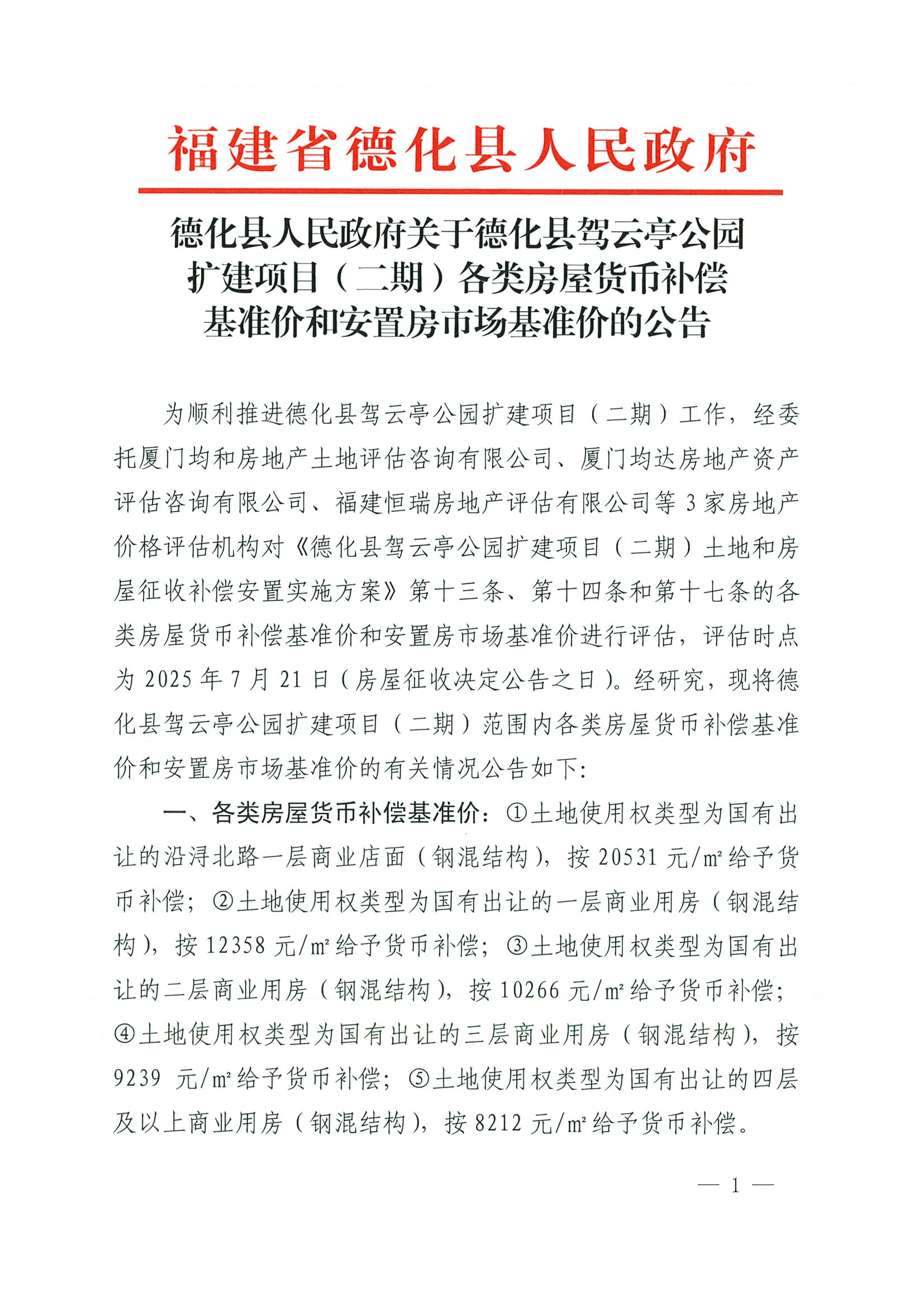 驾云亭公园扩建项目(二期)各类房屋货币补偿基准价和安置房市场基准价的公告