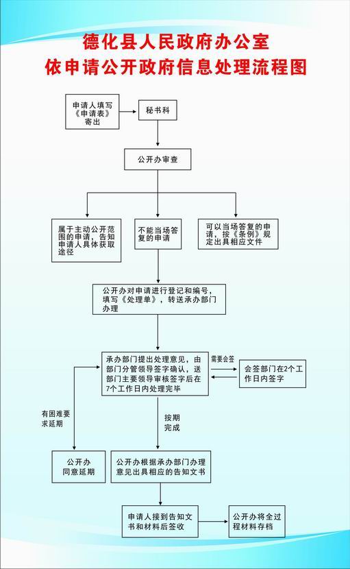 以上过程办理时限为7个工作日。如果具体业务部门认为在规定的时限内完成有困难要求延期的,需报公开办负责人批准,但延长期限最长不超过7个工作日。